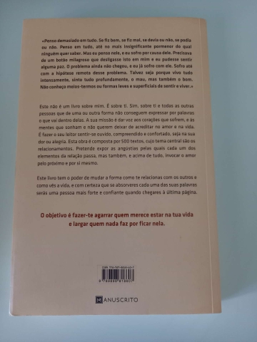 Este não é um livro sobre mim. É sobre ti. Sim, sobre ti e todas as outras pessoas que de uma ou outra forma não conseguem expressar por palavras o que vai dentro delas. A sua missão é dar voz aos corações que sofrem, e às mentes que sonham e não querem deixar de acreditar no amor e na vida. É fazer o seu leitor sentir-se ouvido, compreendido e confortado, seja na sua dor ou alegria. Esta obra é composta por 500 textos, cujo tema central são os relacionamentos. Pretende expor as angústias pelas quais cada um dos elementos da relação passa, mas também, e acima de tudo, invocar o amor pelo próximo e por si mesmo.
