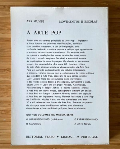 A Arte Pop, por Lucy R. Lippard, é um conhecido estudo que explora o movimento artístico do Pop Art, abordando as suas raízes no Surrealismo, Dadaísmo e na arte folclórica, focando o fenómeno em Nova Iorque e a sua expansão internacional. A obra analisa ícones da Pop como Andy Warhol, Roy Lichtenstein, Claes Oldenburg e James Rosenquist, que se apropriaram da linguagem da publicidade e dos ícones da cultura de massa. O livro é uma análise aprofundada do espírito dos anos 60, destacando o caráter irreverente e revolucionário da Pop Art.