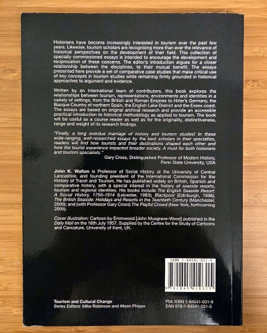 Histories of Tourism: Representation, Identity and Conflict, edited by John K. Walton, is a collection of essays developing the historical dimension to tourism studies through thematic case studies. The editor's introduction argues for the importance of a closer relationship between history and tourism studies, and an international team of contributors explores the relationships between tourism, representations, environments and identities in settings ranging from the global to the local, from the Roman Empire to the twentieth century, and from Frinton to the 'Far East'.