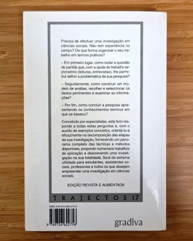 Manual de Investigação em Ciências Sociais, de Raymond Quivy e Luc Van Campenhoudt, é um dos livros de referência incontornáveis da metodologia de investigação em ciências sociais. Publicado originalmente em França em 1995 e traduzido em múltiplos países, continua a ser, décadas depois, uma ferramenta de trabalho central para estudantes, investigadores e professores de sociologia, ciência política, serviço social, comunicação, turismo, educação e áreas afins. Esta 6.ª edição em português, editada pela Gradiva em 2013, e integrada na coleção "Trajectos" (n.º 17), mantém intacta a clareza e o rigor que tornaram a obra num clássico internacional.