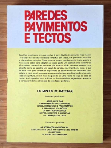 Neste volume surge, precisamente, tudo quanto é necessário saber para adaptar ao nosso gosto um apartamento e definir as “fronteiras” domésticas: como se pinta uma divisão, como se assenta uma alcatifa, como se escolhe um papel de parede, etc. E também, claro, o que se deve fazer para conservar as paredes, os pavimentos e os tectos em bom estado e para acudir aos pequenos contratempos resultantes de uma esfoladela na pintura, de um risco na parede, de uma racha na loiça da casa de banho.