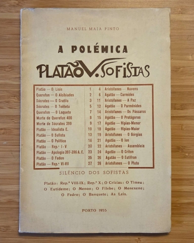 A Polémica Platão v. Sofistas, de Manuel Maia Pinto, é um raro estudo de filosofia grega publicado pela Imprensa Moderna, no Porto, em meados da década de 1950 (na capa surge a data de 1955 e na folha de rosto 1954), num volume de 118 páginas.