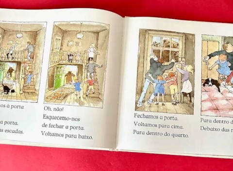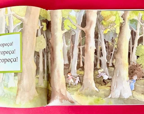 Está um belo dia, e eles vão dizendo que não têm medo, enquanto atravessam um campo de erva alta e ondulante, cruzam um rio fundo e frio, se arrastam através da lama pegajosa, procuram o caminho pelo meio de uma floresta, passam através de um nevão que rodopia e entram pé-ante-pé numa caverna soturna. Aqui, na escuridão, tudo parece diferente...E qual é a coisa temível que aparece diante deles?