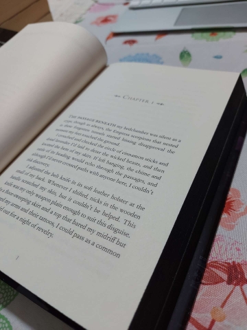 Livro assinado pela autora, com capa exclusiva Fairyloot, ilustração das personagens principais e espinha de cor preta.