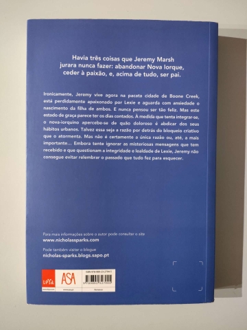 Ironicamente, Jeremy vive agora na pacata cidade de Boone Creek, está perdidamente apaixonado por Lexie e aguarda com ansiedade o nascimento da filha de ambos. E nunca pensou ser tão feliz. Mas este estado de graça parece ter os dias contados. À medida que tenta integrar-se, o nova-iorquino apercebe-se de quão doloroso é abdicar dos seus hábitos urbanos. Talvez essa seja a razão por detrás do bloqueio criativo que o atormenta. Mas não é certamente a única razão ou, até, a mais importante… Embora tente ignorar as misteriosas mensagens que tem recebido e que questionam a integridade e lealdade de Lexie, Jeremy não consegue evitar relembrar o passado que tudo fez para esquecer.