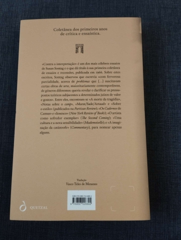 «Contra a interpretação» é um dos mais célebres ensaios de Susan Sontag e o que dá título à sua primeira coletânea de ensaios e recensões, publicada em 1966. Sobre estes escritos, Sontag observou que escrevia «com fervorosa parcialidade, acerca de problemas que […] suscitavam certas obras de arte, maioritariamente contemporâneas, de géneros diferentes: queria revelar e clarificar os pressupostos teóricos subjacentes a determinados juízos de valor e gostos». Entre eles, encontram-se «A morte da tragédia», «Notas sobre o camp», «Marat/Sade/Artaud» e «Sobre o estilo» (publicados na Partisan Review); «Os Cadernos de Camus» e «Ionesco» (New York Review of Books); «O artista como sofredor exemplar» (The Second Coming); «Uma cultura e a nova sensibilidade» (Mademoiselle); e «A imaginação da catástrofe» (Commen-tary), para nomear apenas alguns.