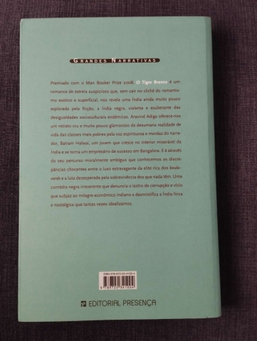 O Tigre Branco arrebatou por unanimidade o Man Prémio Booker Prize de 2008, um dos mais prestigiados galardões literários a nível mundial. Ainda antes da sua nomeação para o prémio, O Tigre Branco era já apontado como um dos melhores romances do ano e Aravinda Adiga como uma grande revelação e um extraordinário romancista. A shortlist para o Booker era composta por candidatos muito fortes, muito embora O Tigre Branco tenha conquistado o júri a uma só voz. Romance de estreia, entrou de imediato nas preferências dos críticos, que o classificaram como "uma estreia brilhante e extraordinária". O livro revela uma Índia ainda muito pouco explorada pela ficção, a Índia negra, violenta e exuberante das desigualdades socioculturais. Toda a obra é uma longa carta dirigida ao Primeiro-Ministro chinês, escrita ao longo de sete noites. O autor da carta apresenta-se como o tigre branco do título, e auto-denomina-se um "empreendedor social". Descrevendo a sua notável ascensão de pobre aldeão a empresário e empreendedor social, o autor da carta, Balram, acaba por fazer uma denúncia mordaz das injustiças e peculiaridades da sociedade indiana. Fica assim feito o retrato de uma sociedade brutal, impiedosa, em que as injustiças se perpetuam geração após geração, como uma ladainha que se entoa incessantemente ao ritmo de uma roda de orações. São muito poucos os animais que conseguem abrir um buraco na vedação e escapar ao destino do cárcere eterno. O Tigre Branco é um deles.