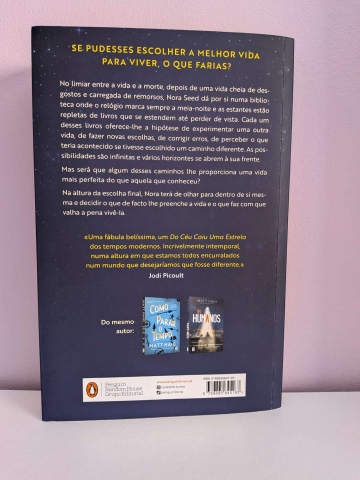 No limiar entre a vida e a morte, depois de uma vida cheia de desgostos e carregada de remorsos, Nora Seed dá por si numa biblioteca onde o relógio marca sempre a meia-noite e as estantes estão repletas de livros que se estendem até perder de vista. Cada um desses livros oferece-lhe a hipótese de experimentar uma outra vida, de fazer novas escolhas, de corrigir erros, de perceber o que teria acontecido se tivesse escolhido um caminho diferente. As possibilidades são infinitas e vários horizontes se abrem à sua frente.