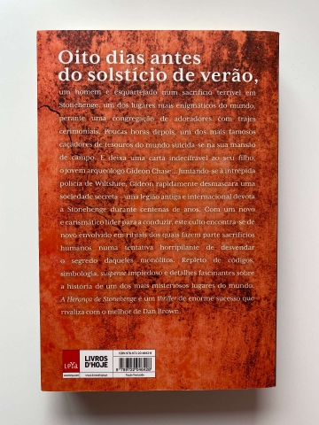 Oito dias antes do solstício de verão, um homem é esquartejado num terrível sacrifício no local antigo de Stonehenge perante uma congregação de adoradores com trajes cerimoniais. Em poucas horas, um dos mais famosos caçadores de tesouros do mundo suicida-se na sua mansão no campo. E deixa uma carta indecifrável ao seu filho, o jovem arqueólogo Gideon Chase Juntando-se à intrépida mulher polícia de Wiltshire, Gideon rapidamente desmascara uma sociedade secreta uma legião antiga e internacional devota ao Stonehenge durante centenas de anos. Com um novo e carismático líder para a conduzir, este culto encontra-se no momento envolvido em rituais com sacrifícios humanos numa tentativa horripilante de desvendar o segredo das pedras. Repleto de códigos, simbologia, suspense impiedoso e detalhes fascinantes sobre a história de um dos mais misteriosos lugares do mundo, A Herança do Stonehenge é um thriller de enorme sucesso que rivaliza com o melhor de Dan Brown.