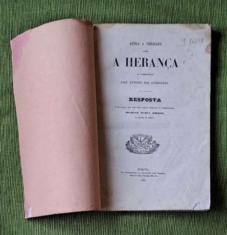 Ainda a Verdade sobre A HERANÇA do commendador José António dos Guimarães. RESPOSTA a um livro, que com este titulo publicou o commendador Joaquim Maria Osorio da cidade de Lisboa. Porto, 1860. B.; 126+ (1) pág.; 210 mm.