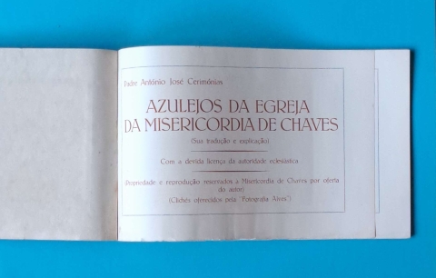 Azulejos da Egreja da Misericordia de Chaves. (Sua tradução e explicação). Com a devida licença da autoridade eclesiástica. (Propriedade e reprodução reservados à Misericórdia de Chaves por oferta do autor). (Clichés oferecidos pela "Fotografia Alves"). Prólogo do Padre Manuel d`Aguiar Barreiros.