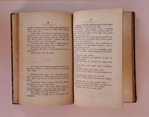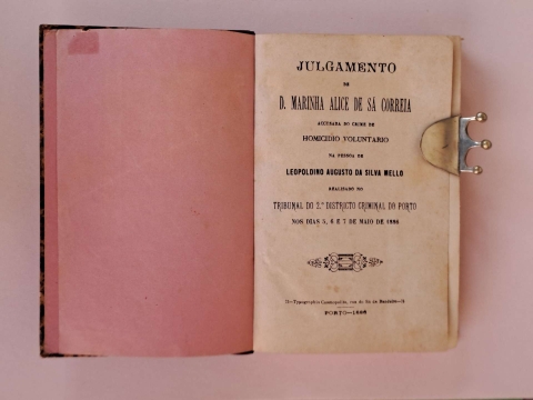 CORREIA DE MAGALHÃES, Luiz Marianno/ SANTOS REGADAS, Antonio José (Editores) - JULGAMENTO de D. Marinha Alice de Sá Correia, accusada do crime de, Homicidio Voluntario, na pessoa de, Leopoldino Augusto da Silva Mello, realisado no, Tribunal do 2.º Districto Criminal do Porto, nos dias 5, 6 e 7 de Maio de 1886. 75- Typographia Cosmopolita, rua Sá da Bandeira-75, Porto, 1886. Ao ILLm.º e Exm.º Snr. Conselheiro Clemente José dos Santos, Dignissimo Director Geral da Repartição Tachygraphica da Camara dos Deputados, Como prova do mais alto respeito, estima e consideração, OFFERECEM, este singelo, mas consciencioso trabalho, Os Editores, Luiz Mariano Correia de Magalhães, Tachygrapho da Camara dos Deputados e Antonio Jose dos Santos Regadas Collaborador do «Commercio do Porto».