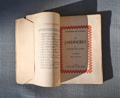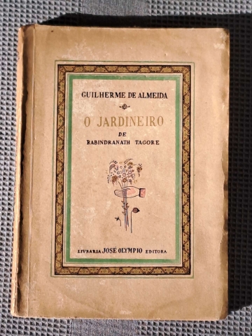 ALMEIDA, Guilherme de - O JARDINEIRO de Rabindranath Tagore. 2ª Edição. Capa de Santa Rosa.1943. Rio de Janeiro. B.; (1) fl bco+ 128+ (1) pág. Exemplar com uma assinatura de posse na 1ª fl. em bco. Livro raro.