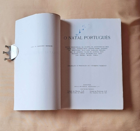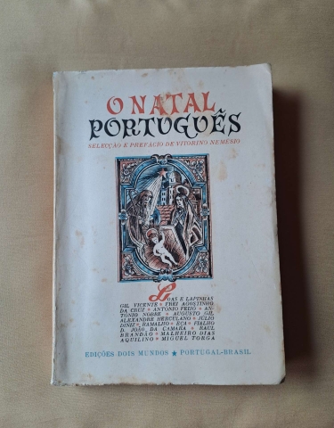 O NATAL PORTUGUÊS - Textos tradicionais. Gil Vicente. Fr. Agostinho da Cruz. Gomes Leal. António Feijó. António Nobre. Augusto Gil. Herculano. Júlio Dinis. Ramalho Ortigão. Eça de Queiroz. Fialho de Almeida. Raul Brandão. Carlos Malheiro Dias. Aquilino Ribeiro. Miguel Torga. Selecção e Prefácio de Vitorino Nemésio. Edições Dois Mundos. Editora L.da. Lisboa 1944. B., com a bonita capa de Bernardo Marques; XV+ 187+ (4) págs.; 205 mm. O exemplar apresenta ligeiras e pequenas manchas de acidez nas capas de brochura, uma assinatura de posse, meia apagada, na folha de rosto e um bonito ex-libris. O interior do livro está em muito bom estado. Achámos que melhorava a sua apresentação e porque na nossa opinião é uma obra que justificava, encadernámo-lo com papel vegetal.
