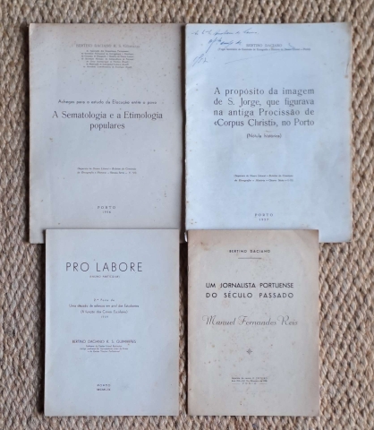 DACIANO, Bertino - A propósito da imagem de S. Jorge, que figurava na antiga Procissão de «Corpus Christi», no Porto. (Nótula histórica). (Separata de Douro Litoral - Boletim da Comissão de Etnografia e História - Oitava Série - I-II). Porto, 1957. B.; 11 págs.+ 8 fls. extratexto com ilusts.; 250 mm. Com dedicatória do autor. E um ex-libris do proprietário do exemplar.