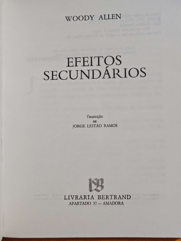 "Efeitos Secundários" é o título de um livro de Woody Allen que reúne contos curtos que misturam humor, filosofia, psicanálise e absurdos existenciais. Não se refere a um filme, mas sim a uma coleção de textos publicada originalmente na década de 1980, onde Allen explora temas do quotidiano e da mente humana de forma irónica.
