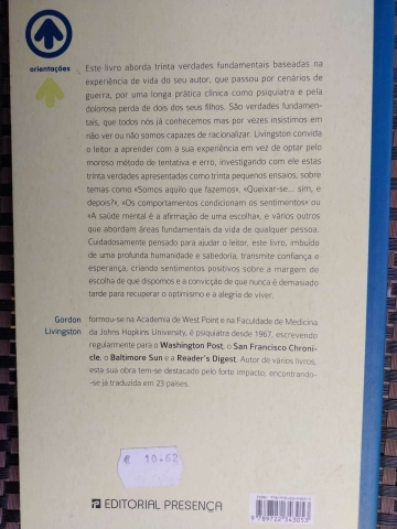 Gordon Livinston formou-se na Academia de West Point e na Faculdade de Medicina da Johns Hopkins University, é psiquiatra desde 1967 e neste livro aborda trinta verdades fundamentais baseadas na sua experiência de vida. São verdades fundamentais, mas que por vezes insistimos em não ver ou não somos capazes de racionalizar. Livingstone convida o leitor a investigar com ele, nestes trinta pequenos ensaios sobre temas que abordam áreas fundamentais da vida. Cuidadosamente pensado, imbuído de uma profunda humanidade e sabedoria, esta obra transmite confiança e esperança, criando sentimentos positivos e a convicção de que nunca é demasiado tarde para recuperar o optimismo e a alegria de viver.