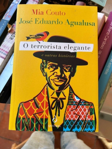Na história «O terrorista elegante» (escrita a quatro mãos sob um alpendre, em Boane, Moçambique), que dá título ao livro, um angolano é preso em Portugal por suspeita de participação em atos de terrorismo. O homem alega ser capaz de voar e conversa com um passarinho na prisão, que parece dar-lhe as orientações necessárias para que cumpra a sua missão.
