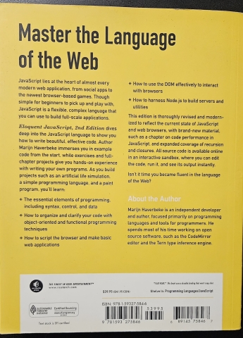 Eloquent JavaScript, 2nd Edition dives deep into the JavaScript language to show you how to write beautiful, effective code. Author Marijn Haverbeke immerses you in example code from the start, while exercises and full-chapter projects give you hands-on experience with writing your own programs. As you build projects such as an artificial life simulation, a simple programming language, and a paint program, you’ll learn: