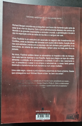 Um clássico da ficção científica moderna sobre os perigos do capitalismo selvagem Richard Morgan convida-nos a mergulhar num futuro tão horrendo quão certo de estar já ao virar da esquina. Com o povo definitivamente afastado dos centros de decisão e as grandes corporações a controlar o mundo, a globalização é brutal e não há separação entre as salas de reunião e o sangue nas ruas. Chris Faulkner é um executivo em ascensão no negócio dos Investimentos em Conflitos, onde as decisões são tomadas com duelos até à morte.