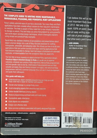 The Complete Guide to Writing More Maintainable, Manageable, Pleasing, and Powerful Ruby Applications Ruby’s widely admired ease of use has a downside: Too many Ruby and Rails applications have been created without concern for their long-term maintenance or evolution. The Web is awash in Ruby code that is now virtually impossible to change or extend. This text helps you solve that problem by using powerful real-world object-oriented design techniques, which it thoroughly explains using simple and practical Ruby examples.