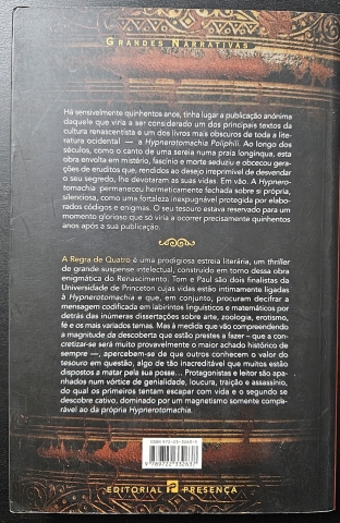 "A Regra de Quatro" divide-se em dois momentos cruciais. Um primeiro, em que os leitores têm de decifrar cinco enigmas sequenciados de diferentes áreas do saber. E um segundo momento em que a mensagem está codificada nos quatro pontos cardiais que representam as coordenadas geográficas para chegar à cripta, procurada por muitos, onde se encontram peças de arte de valor incalculável. Através de uma escrita de grande qualidade criativa, o leitor fica envolvido num ambiente de genialidade, loucura, traição e assassínio, dominado por um magnetismo apenas comparável ao do próprio Hypnerotomachia Poliphili.