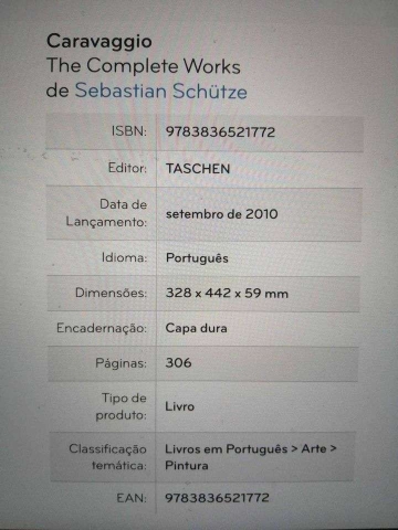 "As Obras Completas" de Caravaggio (2010), edição de luxo encadernada da Taschen. Exemplar em excelente estado de conservação, sem praticamente ter sido manuseado/folheado. Ainda guardo a embalagem original, em cartão grosso, embora esteja já um pouco danificada.