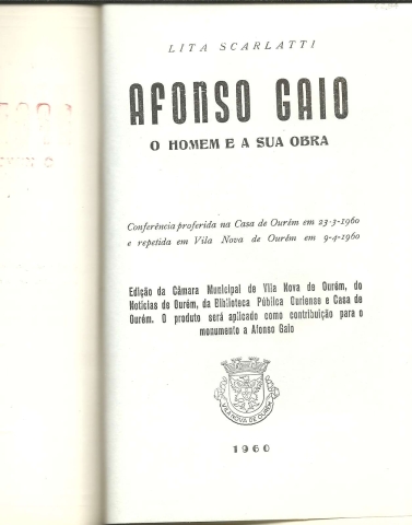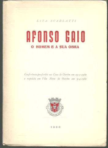 AFONSO GAIO – O HOMEM E A SUA OBRA. Conferência proferida na Casa de Ourém em 23-3-1960 e repetida em Vila Nova de Ourém em 9-4-1960. *** Lita Scarlatti *** Vila Nova de Ourém: Edição da Câmara Municipal de Vila Nova de Ourém, do Notícias de Ourém, da Biblioteca Pública Ouriense e Casa de Ourém, 1960. (21 x 15 cm.) com [4] + 46 + 4 pp + [3] folhas com ilustrações a p/b.. Capa flexível. Exemplar razoável. Capa com marcas de manuseamento, manchas ligeiras e um pequeno desgaste nas margens e na lombada, que se encontram também um pouco amarelecidas e ligeiramente amachucadas em alguns pontos. Apesar de tudo, de um modo geral, está ainda em bom estado e limpa. Páginas bem conservadas e limpas, embora apresentem um ligeiro amarelecimento, próprio do papel. Várias páginas apresentam correcções nas margens, presumivelmente feitas pela autora com caneta azul, de gralhas tipográficas. *** Primeira edição deste livro, que recolhe o texto de uma conferência sobre a vida e a obra de Afonso Gaio, cujo produto da venda se destinava a contribuir para o monumento a erigir ao escritor ouriense. Embora esteja hoje praticamente esquecido, Afonso Gaio foi um destacado poeta, dramaturgo e jornalista, mas também contista e romancista, contando-se ainda entre os pioneiros do cinema português, tendo co-realizado, com Mário Huguin, o filme O Condenado (1921), a partir da adaptação de uma sua peça de teatro homónima, de 1917. Pouco vulgar. *** Portes: envio gratuito em correio normal (tarifa especial para livros) * envio em correio registado: 1,70