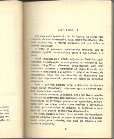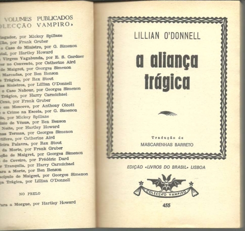 A ALIANÇA TRÁGICA. *** Lillian O’Donnell *** Tradução de Mascarenhas Barreto *** Título da edição original: «Dont’t Wear Your Wedding Ring» *** Lisboa: Edição «Livros do Brasil», 1985. Colecção Vampiro – 455. (16 x 10,5 cm.) com 203 + [3] + VI + [4] pp. Capa flexível. Exemplar razoável. Capa com marcas de manuseamento, vincos discretos, pequenas perdas de cor em alguns pontos e um ligeiro desgaste nas margens e na lombada, mas, de um modo geral, ainda em boas condições e limpa. Páginas bem conservadas e limpas, embora apresentem um tom amarelecido, próprio do papel. *** Presumível primeira edição portuguesa deste romance policial da escritora norte-americana Lillian O’Donnell, originalmente publicado em 1973 e que foi o segundo protagonizado pela detective Norah Mulcahaney, que aqui se infiltra numa rede de prostitutas casadas da área suburbana que procuram rendimentos extra quando os seus maridos estão fora da cidade... Capa de A. Pedro. *** Portes: envio gratuito em correio normal (tarifa especial para livros) * envio em correio registado: 1,70