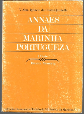ANNAES DA MARINHA PORTUGUEZA. I Parte – Terceira Memoria. *** Vice-Almirante Ignacio da Costa Quintella [Conselheiro d’Estado Honorario, Conselheiro do Real Conselho da Marinha e Socio Honorario da Academia Real das Sciencias] *** Lisboa: Ministério da Marinha, 1975. Colecção Documentos – 18. (23 x 16,5 cm.) com [4] + 122 + [2] pp. Capa flexível, com badanas. Exemplar razoável. Capa envelhecida, com evidentes marcas de uso, perdas de cor em vários pontos, manchas e um pouco gasta e amachucada nas margens e na lombada. Páginas bem conservadas e limpas, apresentando apenas um ligeiro amarelecimento, próprio do papel e da passagem do tempo, e uma ou outra pequena mancha (raras e de muito reduzida importância). *** Provável segunda edição absoluta (primeira na editora) desta obra originalmente publicada em dois tomos (1839-1840), na Typ. da Academia Real das Sciencias de Lisboa, comportando o Tomo I, a Primeira, Segunda e Terceira Memórias e o Tomo II a Quarta Memória. Lê-se numa nota sobre o Autor: «O vice-almirante Inácio da Costa Quintela escreveu os Annaes da Marinha Portugueza, conforme diz na prefação, reunindo o que achou espalhado por vários autores e escolhendo nos pontos controversos o que lhe pareceu mais provável. Das três partes prometidas, apenas foi publicada a primeira, dividida em quatro memórias (...). Assim, dos seus estudos sobre história da Marinha somente se toma conhecimento dos que tratam das guerras, conquistas e viagens dos portugueses na Europa, na América e África Ocidental desde o ano de 1095, no começo do governo do conde D. Henrique, até à aclamação de D. João IV, em 1640.» Esta Terceira Memória, compreende o período que vai desde o ano de 1522 até à morte do Cardeal Rei D. Henrique em 1580. *** Portes: envio gratuito em correio normal (tarifa especial para livros) * envio em correio registado: 1,70