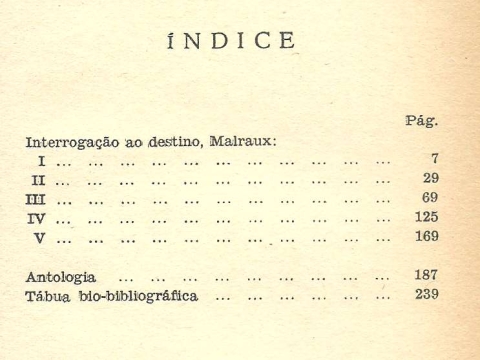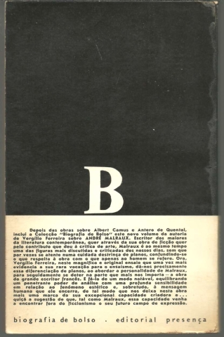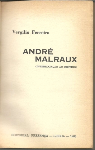 ANDRÉ MALRAUX. (Interrogação ao Destino). *** Vergílio Ferreira *** Lisboa: Editorial Presença, 1963. Colecção: Biografia de Bolso – 3. (18,5 x 12 cm.) com 247 + [1] pp. + [4] folhas com ilustrações a p/b. Capa flexível. Exemplar razoável. Capa com marcas de manuseamento, alguns vincos (os mais importantes no canto superior externo da capa da frente) e um pouco gasta e amarelecida nas margens e na lombada. Globalmente, apesar de um pouco envelhecida, está ainda bastante apresentável. Páginas, de um modo geral, em bom estado e limpas, apresentando, no entanto, um tom amarelecido (mais forte nas margens) e uma ou outra pequena mancha de acidez (raras e perfeitamente naturais tendo em conta a qualidade do papel). *** Primeira edição deste ensaio biográfico sobre o escritor francês André Malraux, talvez o escritor mais admirado por Vergílio Ferreira. Complementado por uma antologia de excertos retirados das principais obras de Malraux e por uma sua tábua bio-biográfica. (Índice completo na imagem 4). Já pouco vulgar. *** Portes: envio gratuito em correio normal (tarifa especial para livros) * envio em correio registado: 1,70
