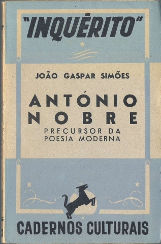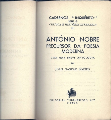ANTÓNIO NOBRE – PRECURSOR DA POESIA MODERNA. Com uma Breve Antologia. *** João Gaspar Simões *** Lisboa: Editorial “Inquérito”, L.da, 1939. Colecção: Cadernos “Inquérito” – 24; Série G: Crítica e História Literária – III. (19 x 12,5 cm.) com 78 + [2] pp. Capa flexível. Bom exemplar. Capa com marcas de manuseamento e um leve desgaste nas margens e na lombada, que se encontra também um pouco escurecida. Apesar de um ligeiro envelhecimento, de um modo geral, está ainda em bom estado e limpa. Páginas bem conservadas e limpas, embora apresentem um tom amarelecido, próprio do papel. *** Primeira edição deste breve, mas importante estudo, que pretende colocar em evidência a importância de António Nobre na renovação da poesia portuguesa. Escreve o Autor: «Poucos poetas como António Nobre terão exercido uma influência tão poderosa nas recentes tendências da poesia portuguesa. Poucos poetas como êle terão sido tão naturalmente originais. Poucos terão devido tão pouco à poesia estrangeira. Eis o precursor da poesia moderna portuguesa que influência mais activa continua a exercer nela.» (Índice na imagem 4). Acompanhado de um recorte de jornal, de 8-3-1950, que contém um artigo, também de João Gaspar Simões, intitulado No Cinquentenário da Morte do Cantor do «Só» – Sentido do Nacionalismo de António Nobre. *** Portes: envio gratuito em correio normal * envio em correio registado: 1,70