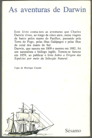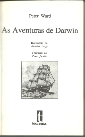 AS AVENTURAS DE DARWIN. *** Peter Ward *** Ilustrações de Annabel Large *** Tradução de Pedro Jordão *** Título original: The Adventures of Charles Darwin *** Edição original: Cambridge University Press, 1982 e 1986 *** Lisboa: Editorial Teorema, Lda., 1988. Colecção: Sésamo – 6. (18,5 x 12 cm.) com 111 + [1] pp. Com algumas ilustrações a p/b.. Capa flexível. Exemplar razoável. Capa com marcas de manuseamento, vincos discretos, manchas de acidez (mais visíveis no lado de dentro), pequenas perdas de cor em alguns pontos e um ligeiro desgaste nas margens e na lombada, mas, de um modo geral, ainda bastante apresentável. Páginas bem conservadas e limpas, embora as primeiras e as últimas se apresentem um pouco amarelecidas e com manchas ténues de acidez, tudo resultante certamente do contacto com a parte de dentro da capa. *** Primeira edição portuguesa desta obra destinada ao público infanto-juvenil que narra «as aventuras que Charles Darwin viveu, ao longo de cinco anos, numa viagem de barco pelos mares do Pacífico, passando pela Terra do Fogo, pelas ilhas Galápagos e pelas ilhas de coral dos mares do Sul» e que muito contribuiu para o amadurecimento no seu espírito da teoria científica da evolução pela selecção natural. (Índice na imagem 4). Capa de Henrique Cayatte. *** Portes: envio gratuito em correio normal (tarifa especial para livros) * envio em correio registado: 1,70