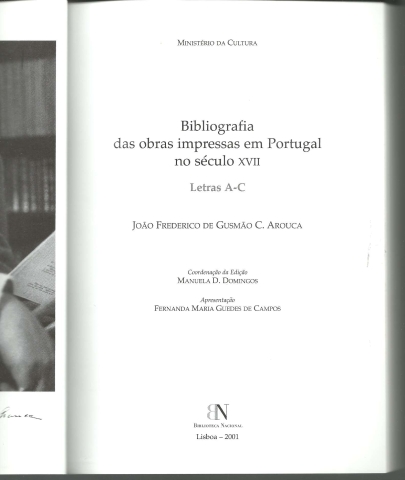 BIBLIOGRAFIA DAS OBRAS IMPRESSAS EM PORTUGAL NO SÉCULO XVII. Letras A-C. *** João Frederico de Gusmão C. Arouca *** Coordenação da Edição: Manuela D. Domingos *** Apresentação: Fernanda Maria Guedes de Campos *** Pesquisa de cotas e confronto de exemplares: Maria Idalina Portugal – Maria do Rosário Reis Gomes (colab.) *** Revisão técnica e índices: Manuel Alves *** Lisboa: Biblioteca Nacional, 2001. Colecção: Bibliografias. (23,5 x 16,5 cm.) com XL + 602 + [6] pp. Com algumas ilustrações. Capa flexível, com badanas. Bom exemplar. Capa com pequenas marcas de manuseamento e um ligeiro desgaste nas margens, encontrando-se em bom estado e limpa. Páginas bem conservadas e limpas. *** Primeira edição desta obra que «tem todas as características próprias de um instrumento de referência patrimonial. Uma obra em cinco volumes (A-C; D-L; M-R; S-Z e Índices: títulos, impressores, locais de impressão e cronológico) com cerca de 6000 entradas. «Obra de autor», monumental e exaustiva, sobre um período da nossa História do Livro e da Imprensa muito pouco conhecido, será, certamente, uma referência incontornável para estudiosos. bibliotecários, livreiros-antiquários, bibliógrafos e bibliófilos em geral.» Resultando de quatro décadas de perseverante labor, a Bibliografia das Obras Impressas em Portugal no Século XVII, coligida por João Frederico de Gusmão Corrêa Arouca (1908-1990), preenche uma lacuna na História do Livro e da Imprensa em Portugal, dando continuidade ao trabalho de António Joaquim Anselmo para a Tipografia Portuguesa do Século XVI. A obra assinala as edições seiscentistas existentes nas principais bibliotecas portuguesas e em algumas estrangeiras, constituindo-se numa fonte de informação imprescindível para assuntos de natureza bibliográfica (e não só) dessa época. Para esta edição procedeu-se a uma revisão exaustiva do original deixado pelo Autor – dactiloscrito num conjunto de nove pastas, com cerca de 2300 folhas, das quais 2192 contêm as notícias bibliográficas das obras recenseadas. Este volume encerra os livros seiscentistas portugueses cujos apelidos dos respectivos autores começam pelas iniciais A, B e C. (Índice na imagem 4). Tiragem de apenas 750 exemplares. *** Portes: envio gratuito em correio normal (tarifa especial para livros) * envio em correio registado: 1,70