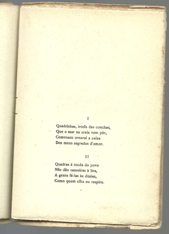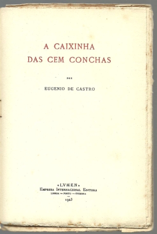 A CAIXINHA DAS CEM CONCHAS. *** Eugenio de Castro *** Lisboa – Porto – Coimbra: «Lvmen» – Empresa Internacional Editora, 1923. (18 x 12 cm.) com 36 + [4] pp. Capa flexível, com as margens dobradas para dentro. Exemplar razoável. Capa com marcas de manuseamento, algumas manchas, ligeiramente empoeirada e um pouco gasta nas margens e na lombada, onde apresenta mesmo alguns rasgões e a falta de pequenos pedaços de papel, tudo de reduzida importância. Globalmente, apesar de um pouco envelhecida, encontra-se ainda apresentável. Páginas, de um modo geral, em bom estado, embora apresentem pequenas manchas de acidez, muito típicas do tipo de papel utilizado, e que embora estejam razoavelmente disseminadas, se concentram mais nas primeiras e nas últimas. Tem ainda um pedacinho de papel azul colado perto da base da primeira página (tratando-se, provavelmente, do resto de uma etiqueta de livraria entretanto removida). *** Primeira edição deste estimado livrinho de Eugénio de Castro, considerado o introdutor do simbolismo em Portugal, com a obra «Oaristos» (1890), mas que após essa fase inicial da sua produção poética, rica de ousadias e novidades formais, adquiriu, sobretudo na fase final da sua vida, uma sobriedade expressiva, muitas vezes de matriz conservadora e inspiração tradicionalista, de que este volume, recolhendo cem quadras de sabor popular, é um excelente exemplo. Já pouco vulgar. *** Portes: envio gratuito em correio normal (tarifa especial para livros) * envio em correio registado: 1,70