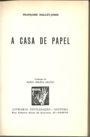 A CASA DE PAPEL. *** Françoise Mallet-Joris *** Tradução de Maria Helena Araújo *** Título da obra original: La Maison de Papier *** Porto: Livraria Civilização – Editora, 1971. Colecção de Hoje. (21 x 14 cm.) com [4] + 275 + [1] pp. Capa flexível, com badanas. Exemplar razoável. Capa com marcas de manuseamento, alguns vincos, manchas de acidez (só visíveis na parte de dentro e não muito importantes), um pouco amarelecida (algo mais evidente na contracapa) e com um pequeno desgaste nas margens, apresentando mesmo um pequeno rasgão na base da contracapa. Apesar de tudo, de um modo geral, encontra-se ainda em boas condições. Páginas globalmente bem conservadas e limpas, embora apresentem um tom amarelecido (mais forte junto das margens e, sobretudo, nas primeiras e nas últimas) e algumas pequenas manchas de acidez (raras). A última página tem uma mancha de cola, que a atravessa no meio a toda a altura, provocada por uma estreita faixa da badana onde não chegou a película de plástico transparente que cobre o papel. Conserva a cinta publicitária onde se lê: “80.000 ex. em 3 semanas”. *** Primeira edição portuguesa (teve, pelo menos, uma segunda, em 1974) deste romance da escritora franco-belga Françoise Mallet-Joris, hoje algo esquecida, mas que foi um dos nomes proeminentes da literatura francófona, sobretudo entre as décadas de 1950 e 1970, com uma obra bem recebida pelo público e pela crítica e a que não faltaram sequer algumas polémicas. Originalmente publicado em 1970, e um imenso sucesso na época da sua publicação, A Casa de Papel é um romance com forte toque autobiográfico sobre o quotidiano de um casal de artistas, uma crónica virtuosa dos anos felizes de uma família moderna, que assegurou o seu lugar na categoria dos “clássicos modernos” do século XX. *** Portes: envio gratuito em correio normal (tarifa especial para livros) * envio em correio registado: 1,70