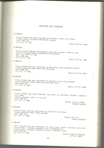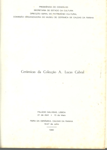CERÂMICAS DA COLECÇÃO A. LUCAS CABRAL. Palácio Galveias, Lisboa – 21 de Abril – 15 de Maio. Feira da Cerâmica, Caldas da Rainha – 18-27 de Julho. – 1980. *** Organização e Catálogo: Conservadora Nicole Ballu Loureiro – Dr.ª Maria Exaltina Gil Nogueira *** Apoio Artístico: Montagem: Decorador Carlos Ribeiro – Escultor Eduardo Loureiro – Maria Margarida Sampaio de Abreu Madeira – Fernando José Sousa Valente *** Cartaz e Capa: Escultor Eduardo Loureiro *** Fotografias: Amílcar M. A. Figueiredo *** Introdução: Irisalva Moita [O Conservador-Chefe dos Museus Municipais de Lisboa] *** [Lisboa]: Presidência do Concelho [sic] – Secretaria de Estado da Cultura – Direcção-Geral do Património Cultural; [Caldas da Rainha]: Comissão Organizadora do Museu de Cerâmica de Caldas da Rainha, 1980. (Execução Gráfica: Bernardino Santos, Lda. – Rio Maior). (24,5 x 17 cm.) com [112] pp. (numeradas 113 + [1]). com muitas ilustrações a p/b. + [8] folhas com ilustrações a cores. Capa flexível. Exemplar razoável. Capa com marcas de manuseamento, vincos discretos, pequenas perdas de cor em alguns pontos, manchas de acidez (visíveis tanto exteriormente como na parte de dentro e especialmente concentradas na contracapa) e um pouco gasta nas margens e na lombada. Globalmente, apesar de envelhecida e manchada, está ainda apresentável. Páginas, de um modo geral, em bom estado e limpas, embora apresentem um tom amarelecido e pequenas manchas de acidez, quase só nas primeiras, nas últimas e nos cortes, mas que acabam por conferir-lhes um aspecto envelhecido e pouco limpo. *** Trata-se, como adverte uma folha solta que acompanha o livro, de uma versão preliminar ou provisória do Catálogo, contendo apenas os textos, que pretendia substituir a versão definitiva até à sua entrega. Nessa versão, o catálogo inclui numerosas ilustrações a p/b. e oito folhas com ilustrações a cores reproduzindo todas as peças descritas, além de que o papel é de melhor qualidade. Este interessante catálogo destinava-se a acompanhar as várias exposições da Colecção de Cerâmica das Caldas do Sr. Alfredo Lucas Cabral, adquirida pelo Estado para integrar o acervo do Museu de Cerâmica das Caldas da Rainha, na época ainda em fase de instalação. A colecção é composta por mais de 300 peças, na sua maior parte das fábricas bordalianas, assinadas muitas por Rafael Bordalo Pinheiro ou por Manuel Gustavo Bordalo Pinheiro, e inclui alguns exemplares únicos. Nesta versão o catálogo contém apenas a descrição das 307 peças que constituem a colecção, sem as respectivas imagens. É bastante mais invulgar esta versão “apressada”, talvez para acorrer às exigências de algum responsável pelas exposições. *** Portes: envio gratuito em correio normal (tarifa especial para livros) * envio em correio registado: 1,70