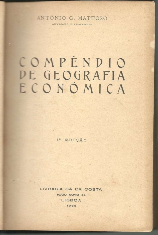 COMPÊNDIO DE GEOGRAFIA ECONÓMICA. *** António G. Mattoso [Advogado e Professor] *** Lisboa: Livraria Sá da Costa, 1933. [Edição e Propriedade de António G. Mattoso – Leiria]. (22 x 14,5 cm.) com [12] + 365 + [3] pp. Com muitas ilustrações a p/b.. Cartonagem editorial. Exemplar razoável, Capa com fortes marcas de uso, manchada, descolorida em alguns pontos e bastante gasta nas margens. A lombada encontra-se um pouco amachucada, especialmente nas extremidades. Globalmente, apesar de ainda sólida, encontra-se envelhecida, um pouco maltratada e pouco limpa. Páginas em relativo bom estado, mas amarelecidas e com manchas de acidez, algo frequentes, embora se concentrem mais nas folhas de guarda. Em suma: bom exemplar para leitura, mas pouco atraente. *** Primeira edição deste livro destinado fundamentalmente aos alunos do ensino técnico. Escreve o Autor, no prefácio: «Procuramos nesta obra seguir o método adoptado no nosso Compêndio de Geografia Geral, de maneira a apresentar aos alunos das escolas técnicas um quadro tanto quanto possível aproximado do âmbito, dos fins e da utilidade da Geografia Económica, tendo sempre em vista as exigências dos programas respectivos. Para conseguirmos êste objectivo, pareceu-nos necessário alargar um pouco a exposição das matérias, de forma a que a mesma não resultasse demasiadamente esquemática e sêca, um resumo inexpressivo que nada diria ao espírito dos alunos.» (Na imagem 4 está apenas o começo do índice). *** Portes: envio gratuito em correio normal (tarifa especial para livros) * envio em correio registado: 1,70