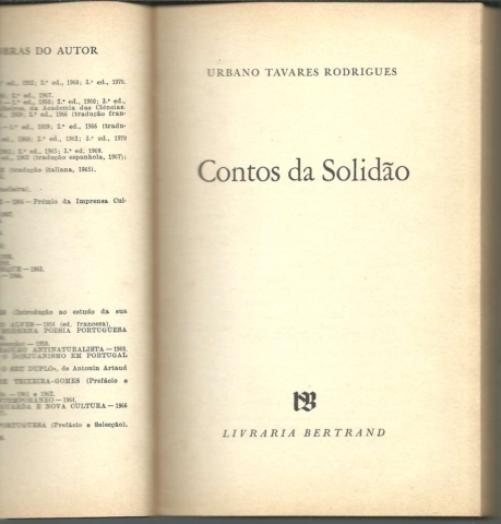 CONTOS DA SOLIDÃO. *** Urbano Tavares Rodrigues *** [Sem ind. de local: Lisboa (?)]: Livraria Bertrand, [1970]. Colecção Autores Portugueses. (19 x 12,5 cm.) com 280 + [4] pp. Capa flexível, com badanas. Exemplar razoável. Capa com marcas de manuseamento, algumas manchas, pequenas perdas de cor em alguns pontos e um pouco gasta nas margens e na lombada, que apresenta também vincos de abertura. Apesar de um pouco envelhecida, globalmente, está ainda muito apresentável. Páginas, de um modo geral, bem conservadas e limpas, embora apresentem um tom amarelecido e algumas pequenas manchas de acidez (pouco importantes e pouco frequentes). *** Primeira edição deste livro sobre o qual escreve o Autor: «De «Contos da Solidão» titulei este livro não por as histórias que o compõem visarem deliberadamente a exprimir tal sentimento senão porque, num período bem difícil e doloroso da minha vida, lutando contra o isolamento e contra o desespero, só achei como terapêutica para colmar o silêncio em que me debatia a invenção de tais narrativas, quase sempre breves, antídoto da angústia. Eram para mim, mais do que distracção, meio de salvação. » (Índice na imagem 4). Capa de Henrique Ruivo. *** Portes: envio gratuito em correio normal (tarifa especial para livros) * envio em correio registado: 1,70