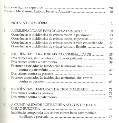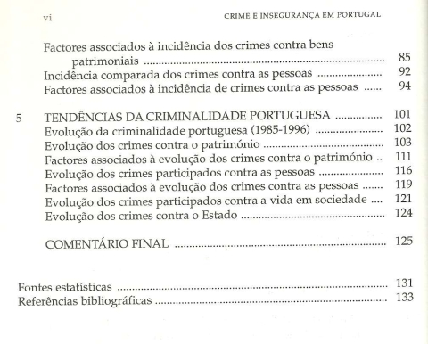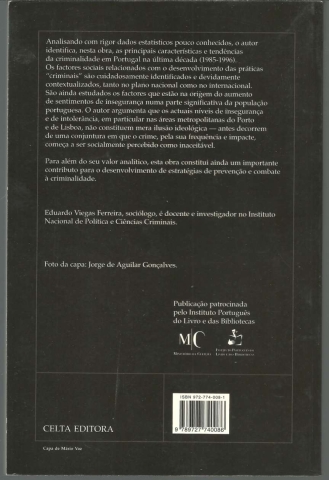 CRIME E INSEGURANÇA EM PORTUGAL. Padrões e Tendências, 1985-1996. *** Eduardo Viegas Ferreira *** Prefácio: Manuel António Ferreira Antunes *** Oeiras: Celta Editora, 1998. (23,5 x 15,5 cm.) com XIII + [3] + 135 + [1] pp. Ilustrado com várias figuras e quadros. Capa flexível. Exemplar razoável. Capa com marcas de manuseamento, manchas de acidez (só visíveis na parte de dentro) e um leve desgaste nas margens, mas, de um modo geral, ainda em boas condições. Páginas globalmente bem conservadas e limpas, embora apresentem um tom amarelecido e algumas pequenas manchas (quase só nas primeiras, nas últimas e nos cortes. *** Primeira edição desta obra, na qual o Autor, analisando com rigor dados estatísticos pouco conhecidos e trabalhados, identifica as principais características e tendências da criminalidade em Portugal no período de 1985 a 1996. «Os factores sociais relacionados com o desenvolvimento das práticas “criminais” são cuidadosamente identificados e devidamente contextualizados, tanto no plano nacional como no internacional. São ainda estudados os factores que estão na origem do aumento de sentimentos de insegurança numa parte significativa da população portuguesa. O autor argumenta que os actuais níveis de insegurança e de intolerância, em particular nas áreas metropolitanas do Porto e de Lisboa, não constituem mera ilusão ideológica – antes decorrem de uma conjuntura em que o crime, pela sua frequência e impacte, começa a ser socialmente percebido como inaceitável.» (Índice nas imagens 3 e 4). Tiragem de 1000 exemplares. *** Portes: envio gratuito em correio normal (tarifa especial para livros) * envio em correio registado: 1,70