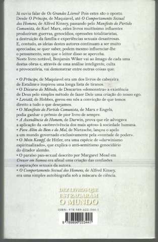 DEZ LIVROS QUE ESTRAGARAM O MUNDO e Mais Cinco Que Também Não Ajudaram Nada. *** Benjamin Wiker *** Título original: 10 Books that Screwed Up the World *** Tradução: Maria José Figueiredo *** Revisão: José João Leiria *** Lisboa: Alêtheia Editores, 2011. (22 x 14 cm.) com 291 + [3] pp. Capa flexível. Exemplar razoável. Capa com marcas de manuseamento, manchas ligeiras, pequenos vincos, pequenas perdas de cor em alguns pontos e com um ligeiro desgaste nas margens e na lombada. Apesar de tudo, de um modo geral, está ainda em boas condições. Páginas bem conservadas e limpas. *** Primeira edição portuguesa deste muito curioso e interessante livro, no qual o Autor analisa, com inteligência e intenção provocatória, o efeito nefasto para a humanidade de quinze livros que, em diversas áreas, influenciaram profundamente o pensamento ocidental e mesmo universal. (Índice nas imagens 3 e 4). *** Portes: envio gratuito em correio normal (tarifa especial para livros) * envio em correio registado: 1,70