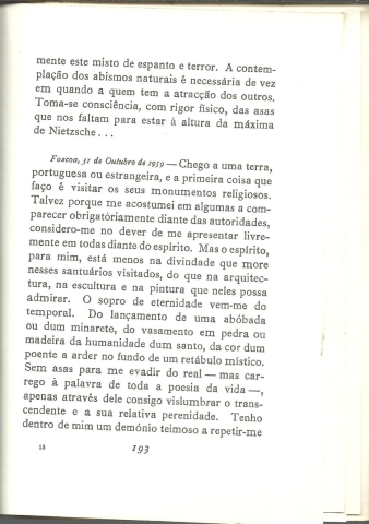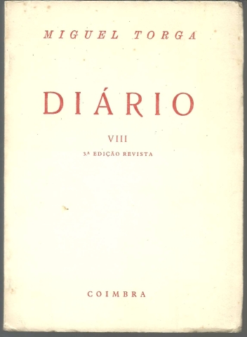 DIÁRIO – VIII. *** Miguel Torga *** Coimbra: [Sem ind. de editor: Edição do Autor], [1976]. (Composto e impresso na «Gráfica de Coimbra»). (19,5 x 14 cm.) com 198 + [2] pp. Capa flexível. Exemplar razoável. Capa com marcas de manuseamento, algumas manchas, ligeiramente empoeirada e um pouco gasta e amachucada nas margens e na lombada, que apresentam também pequenas áreas superficialmente roídas pela traça. No canto inferior direito da contracapa tem uma esfoladela provocada, muito provavelmente, pela remoção de uma etiqueta autocolante. Globalmente, apesar de um pouco envelhecida, está ainda apresentável. Páginas bem conservadas e limpas, encontrando-se ainda totalmente por abrir. *** 3.ª edição revista do oitavo volume (de um total de 16) do Diário de Miguel Torga, que cobre um período que vai de Outubro de 1955 a Dezembro de 1959, e onde, à semelhança dos outros volumes, se encontram algumas das mais belas páginas e poemas que saíram da pena do extraordinário escritor transmontano. *** Portes: envio gratuito em correio normal (tarifa especial para livros) * envio em correio registado: 1,70