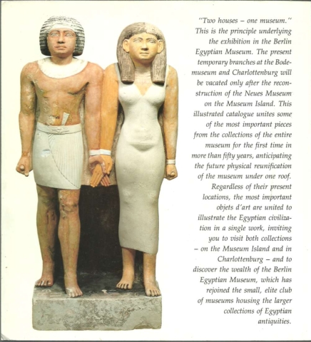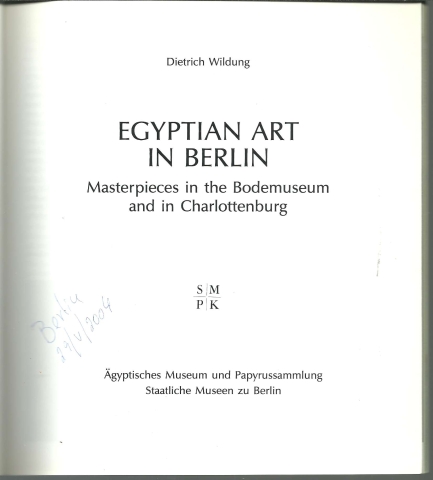 EGYPTIAN ART IN BERLIN. Masterpieces in the Bodemuseum and in Charlottenburg. *** Dietrich Wildung *** [Berlin]: Ägyptisches Museum und Papyrussammlung – Staatliche Museen zu Berlin, [Sem ind. de ano: 1998 (?) – data do texto de introdução]. (Mainz am Rhein: Verlag Philipp von Zabern). (23 x 21 cm.) com [4] + 60 + [4] pp. Profusamente ilustrado a cores. Capa flexível. Exemplar razoável. Capa com marcas de manuseamento, alguns vincos discretos no canto inferior externo da capa da frente e um ligeiro desgaste nas margens, mas, de um modo geral, ainda em bom estado e limpa. Páginas bem conservadas e limpas. Tem, no entanto, uma data manuscrita no rosto. *** Catálogo ilustrado que reúne algumas das peças mais importantes do acervo do Museu Egípcio de Berlim, constituindo um importante documentário sobre a arte e a civilização do antigo Egipto. O livro está acompanhado por quatro folhas impressas em ambos os lados, aparentemente produzidas pelo mesmo museu e contendo artigos, em língua inglesa, relativos ao antigo Egipto: “Ancient Egyptian History-Writing: Annals and King-Lists”; ”Social, Political, and Economic Stucture of Ancient Egypt”; “Amarna and the bust of Nefertiti” (1) e (2). Texto em inglês. Impresso em bom papel. *** Portes: envio gratuito em correio normal (tarifa especial para livros) * envio em correio registado: 1,70