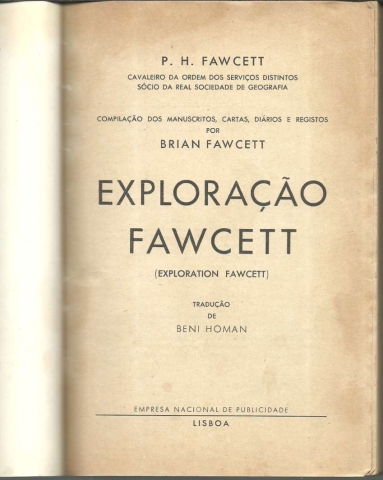 EXPLORAÇÃO FAWCETT. (Exploration Fawcett). *** P. H. Fawcett [Cavaleiro da Ordem dos Serviços Distintos – Sócio da Real Sociedade de Geografia] *** Compilação dos manuscritos, cartas, diários e registos por Brian Fawcett. *** Ilustrações de Brian Fawcett *** Tradução de Beni Homan *** Lisboa: Empresa Nacional de Publicidade, [Sem ind. de ano: 1957 (?)]. Colecção Ciência e Viagens – 3. (22,5 x 15,5 cm.) com 455 + [3] pp. com várias ilustrações a p/b. + [1] folha desdobrável, com um mapa a p/b. + [10] folhas com ilustrações a p/b. em ambas as faces. Capa flexível. Exemplar razoável. Capa envelhecida, com fortes marcas de manuseamento, vincos, manchas, alguns rasgões e gasta nas margens e sobretudo na lombada, cujas extremidades apresentam alguns rasgões e a falta de pedaços de papel. Tem uma pequena etiqueta de livraria colada na parte de dentro da capa da frente. Páginas em relativo bom estado, embora apresentem um tom amarelecido (um pouco mais forte nas margens), algumas manchas de acidez (mais concentradas nas folhas com as ilustrações e nas páginas contíguas) e algumas marcas de uso, que se traduzem sobretudo por um pequeno desgaste das margens das primeiras e das últimas. Em suma: bom exemplar para leitura, mas algo cansado e um pouco maltratado exteriormente. *** Primeira edição portuguesa deste muito interessante livro sobre as explorações levadas a cabo pelo oficial do Exército inglês Percy H. Fawcett nas selvas do Brasil, Peru e Bolívia. Depois de, numa primeira fase, com o propósito de traçar o mapa das fronteiras bolivianas, ter dirigido várias expedições através de selvas inexploradas, convenceu-se de que o Brasil havia sido primitivamente colonizado por um povo altamente civilizado, originário da Atlântida, acreditando que iria encontrar ruínas de cidades imponentes no meio das suas florestas. Nunca regressou da última expedição que organizou com esse propósito e as várias equipas de busca que tentaram encontrá-lo nunca conseguiram localizar nem sequer um seu vestígio. Já pouco vulgar nesta edição. *** Portes: envio gratuito em correio normal (tarifa especial para livros) * envio em correio registado: 1,70