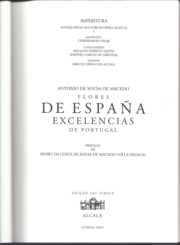 FLORES DE ESPAÑA EXCELENCIAS DE PORTUGAL. *** Antonio de Sousa de Macedo *** Prefácio de Pedro da Costa de Sousa de Macedo (Villa Franca) *** Nota dos Editores: Cristina Virott – António Leite Ribeiro *** Lisboa: Livraria Alcalá, 2003. Colecção: Imperitura – Antiquorum Auctorum Opera Selecta – 1. (27 x 19 cm.) com XXVI + [2] pp. (prefácio) + [32] pp. + 252 ff. (fac simile). Capa flexível, com sobrecapa de papel. Bom exemplar. Sobrecapa com ligeiras marcas de manuseamento, encontrando-se, globalmente, bem conservada e limpa. Capa e páginas em bom estado e limpas. *** Edição fac similada da primeira edição das Flores de España Excelências de Portugal, «publicada em Lisboa, na oficina de Jorge Álvares [curiosamente na capa surge Iorge Rodriguez], em 1631, escrita em castelhano, o que a torna compreensível simultaneamente nos dois países da Península Ibérica.» Como se lê na Introdução: «A recente historiografia portuguesa tem chamado a atenção para a importância das “Flores de España, Excelências de Portugal”, por esta obra permitir uma melhor compreensão das mentalidades, próprias do seu tempo e do seu espaço. Tendo sido escrita num momento especialmente delicado da vida nacional – na fase final da dominação castelhana caracterizada pela monarquia dual que sucedeu ao desastre de Alcácer Quibir – teve como objectivo realçar as características identificadoras da identidade portuguesa.» *** Portes: envio gratuito em correio normal (tarifa especial para livros) * envio em correio registado: 1,70