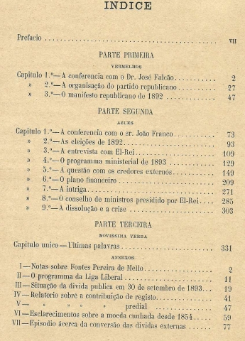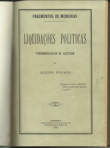Fragmentos de Memorias – LIQUIDAÇÕES POLÍTICAS. Vermelhos e Azues. *** Augusto Fuschini *** Lisboa: Companhia Typographica, 1896. (23,5 x 15,5 cm.) com XV + [1] + 351 + [1] + 82 + [2] pp. Encadernado, conservando a capa e a contracapa originais. Exemplar razoável. Encadernação em percalina azul, tendo colados na lombada (lisa) dois rótulos em pele vermelha com o nome do Autor e o título gravados a ouro. Encadernação com marcas de manuseamento, manchas, um pouco descolorida em alguns pontos e com um ligeiro desgaste nas margens e as extremidades da lombada um pouco amachucadas. Apesar de evidenciar algum envelhecimento, globalmente, está muito sólida e ainda apresentável. Capas originais globalmente bem conservadas, embora apresentem algum envelhecimento e pequenas manchas. Na capa da frente falta um pedacinho de papel no canto inferior externo (com reduzida importância). Páginas em bom estado e limpas, embora apresentem um tom amarelecido (um pouco mais forte junto das margens). *** Primeira edição deste livro de memórias políticas, que se refere sobretudo ao curto período em que, em 1893, Augusto Fuschini exerceu o cargo de Ministro da Fazenda, no Governo de Hintze Ribeiro, com quem viria a incompatibilizar-se, tal como com o Partido Regenerador que apoiava o governo e de que fora anteriormente militante. Sobre esta experiência escreve Fuschini: «Considerando os problemas economicos como base das modernas sociedades, pertenço á eschola socialista, que, em beneficio do maior numero, ao menos, pretende resovel-os pela evolução serena e scientífica. Assim, é meu dever explicar as circumstancias da política nacional, que poderam, no curto ministerio de 1893, approximar-me de homens, cujas doutrinas se haviam manifestado e se pantenteiam ainda hoje, radicalmente oppostas ás minhas opiniões. Depois, contra a minha pessoa moral commetteu-se, com aleivosia e premeditação, uma tentativa de assassínio político, tanto mais aggravante, quanto pretende encerrar bruscamente dezenas d’annos de trabalhos parlamentares, em que sacrifiquei o tempo e, talvez, os interesses sagrados dos que me são caros, em serviços desinteressados ao meu paiz.» Acerca desta obra escreveu Afonso Vargas, referindo-se aos maus processos adoptados na administração pública, dos quais Augusto Fuschini não queria comparticipar, quando ministro, sobretudo ao notar que seria fácil e proveitoso remediá-los: «para obter este desideratum nada mais é necessario fazer de que cada um de nós pôr na consecução delle a mesma somma de independencia de espirito e de riqueza de caracter que o sr. Augusto Fuschini nos mostrou ter posto na factura das liquidações politicas, que sendo já por si um interessante livro, litterariamente fallando, constitue, melhor do que isso, documento inestimavel de coragem moral, de sacrificio voluntario e de desprendimenlo civico.» (Índice na imagem 4). Livro importante para o conhecimento da política portuguesa na fase final do regime monárquico e pouco vulgar. *** Portes: envio gratuito em correio normal (tarifa especial para livros) * envio em correio registado: 1,70