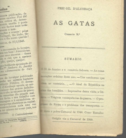 AS GATAS. Conserto N.º 8 (2.ª Série). *** Frei Gil D’Alcobaça [pseudónimo de João Paulo Freire (Mário)] *** Lisboa: Livraria Central de Gomes de Carvalho, Editor, 1946. (19 x 12 cm.) com 31 + [1] pp. Capa flexível. Exemplar razoável. Capa com marcas de manuseamento, algumas manchas, vincos e um pouco amarelecida, mas, de um modo geral, ainda em boas condições. Páginas globalmente bem conservadas e limpas, embora apresentem um tom amarelecido (um pouco mais forte nas margens). *** Primeira edição do oitavo e último folheto da publicação mensal “As Gatas”, na qual João Paulo Freire (Mário), à semelhança de Ramalho Ortigão com As Farpas ou Fialho de Almeida com Os Gatos, traça um retrato crítico (e por vezes risível) de certos aspectos da sociedade portuguesa do seu tempo. (Índice deste número na imagem 4). *** Portes: envio gratuito em correio normal (tarifa especial para livros) * envio em correio registado: 1,70