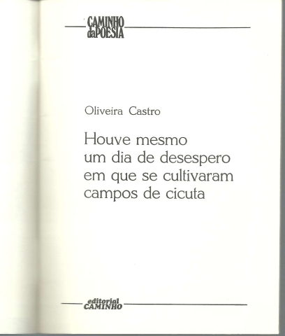 HOUVE MESMO UM DIA DE DESESPERO EM QUE SE CULTIVARAM CAMPOS DE CICUTA. *** Oliveira Castro *** Lisboa: Editorial Caminho, 1985. Colecção: Caminho da Poesia. (18,5 x 13,5 cm.) com 48 pp. Capa flexível. Bom exemplar. Capa com pequenas marcas de manuseamento e ligeiras perdas de cor em alguns pontos, encontrando-se globalmente limpa e em bom estado. Páginas bem conservadas e limpas. *** Primeira edição do primeiro livro do Autor, nascido em Angola, em 1951. Tiragem de apenas 800 exemplares. *** Portes: envio gratuito em correio normal (tarifa especial para livros) * envio em correio registado: 1,70