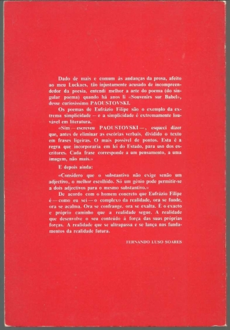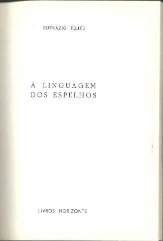 A LINGUAGEM DOS ESPELHOS. *** Eufrázio Filipe [no rosto, por engano, surge Eufrázio Filife] *** Lisboa: Livros Horizonte, 1982. Colecção Horizonte de Poesia – 16. (21 x 14,5 cm.) com 62 + [2] pp. Capa flexível. Exemplar razoável. Capa com marcas de manuseamento, pequenas perdas de cor em alguns pontos e um ligeiro desgaste nas margens e na lombada, mas, de um modo geral, ainda em boas condições e limpa. Páginas bem conservadas e limpas, embora apresentem um tom um pouco amarelecido (mais evidente nas primeiras e nas últimas). *** Primeira edição deste livro de poemas de Eufrázio Filipe, antigo presidente da Câmara Municipal do Seixal e autor de uma obra literária dispersa por vários géneros, que vão da poesia ao conto, passando pelo romance e a crónica política. *** Portes: envio gratuito em correio normal (tarifa especial para livros) * envio em correio registado: 1,70