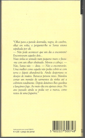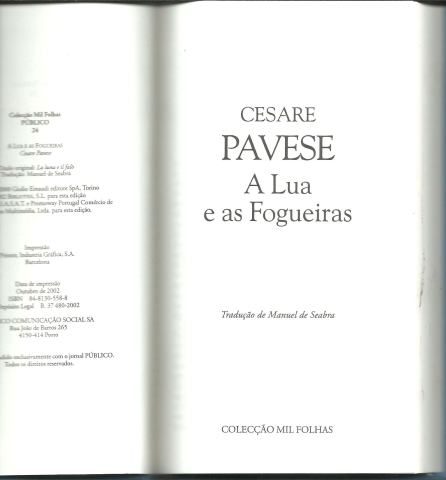 A LUA E AS FOGUEIRAS. *** Cesare Pavese *** Tradução de Manuel de Seabra *** Título original: La luna e il falò *** Porto: Público Comunicação Social SA, 2002. Colecção Mil Folhas – 24. (21 x 12,5 cm.) com 158 + [2] pp. Capa dura, com sobrecapa de papel ilustrada. Bom exemplar. Sobrecapa com marcas de manuseamento, algumas manchas ligeiras, pequenas perdas de cor em alguns pontos e com um leve desgaste nas margens, mas, de um modo geral, ainda em boas condições e limpa. Capa dura com ligeiros sinais de uso, encontrando-se bem conservada e limpa. Páginas em bom estado e limpas, apresentando apenas algumas pequenas manchas nos cortes, de reduzida importância. *** Primeira edição na colecção deste romance originalmente publicado em 1950 e considerado pelo seu autor como uma “modesta Divina Comédia” e o livro que mais prazer lhe deu escrever. *** Portes: envio gratuito em correio normal (tarifa especial para livros) * envio em correio registado: 1,70
